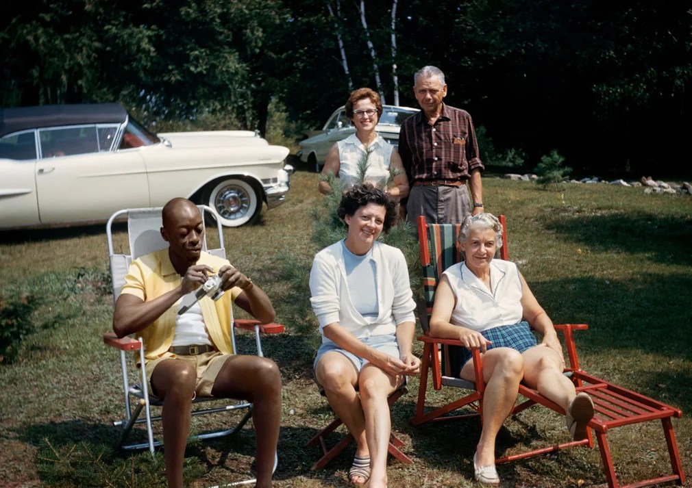 All the participants in this casual family photo appear relaxed and content, an idyllic afternoon in the outdoors, circa 1955. Except…