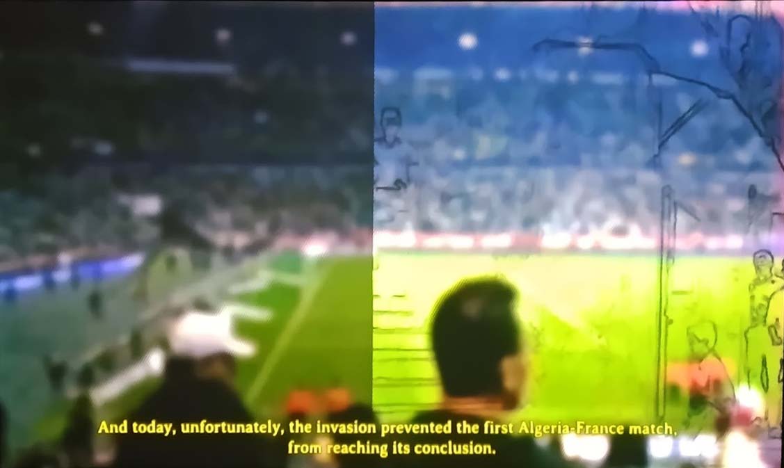 Still from artwork by Joyce Joumaa. The text reads “And today, unfortunately, the invasion prevented the first Algeria France match from reaching its conclusion.”