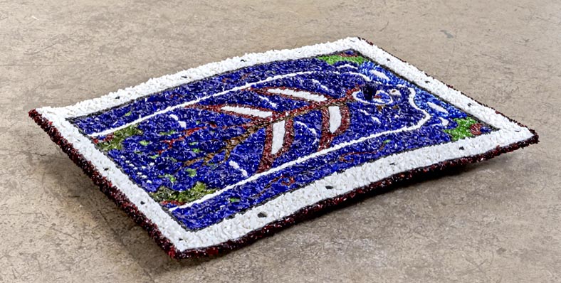 One of my favourite pieces in the show is displayed on the floor, like a colourful, molten carpet. But it’s not quite flat on the floor. It is slightly elevated and arrayed as a very subtle S-curve. Yes, it appears to be flying!