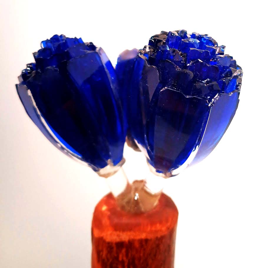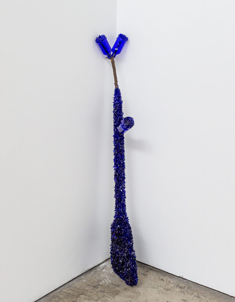 The piece below is a corn broom, coated in glittering, blue light. It’s a humble object, possibly once owned, used and touched by a departed presence and now, elevated to the status of a spiritual relic, a tangible memorial.