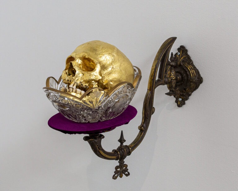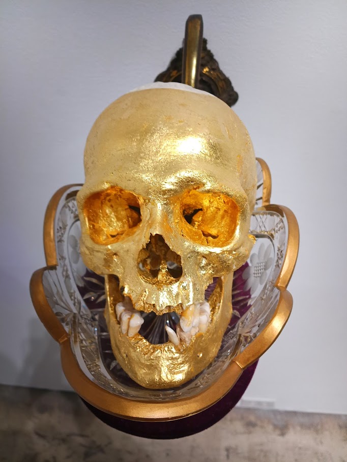 Observing the human skull — clearly real and covered in gold leaf — near the entrance to the Olga Korper Gallery, was unsettling. Resting in a scalloped-edged, glass bowl, the grinning object appears to wear a ruff collar, like some Valesquez subject from the 1600s.