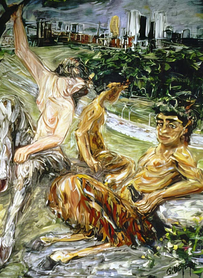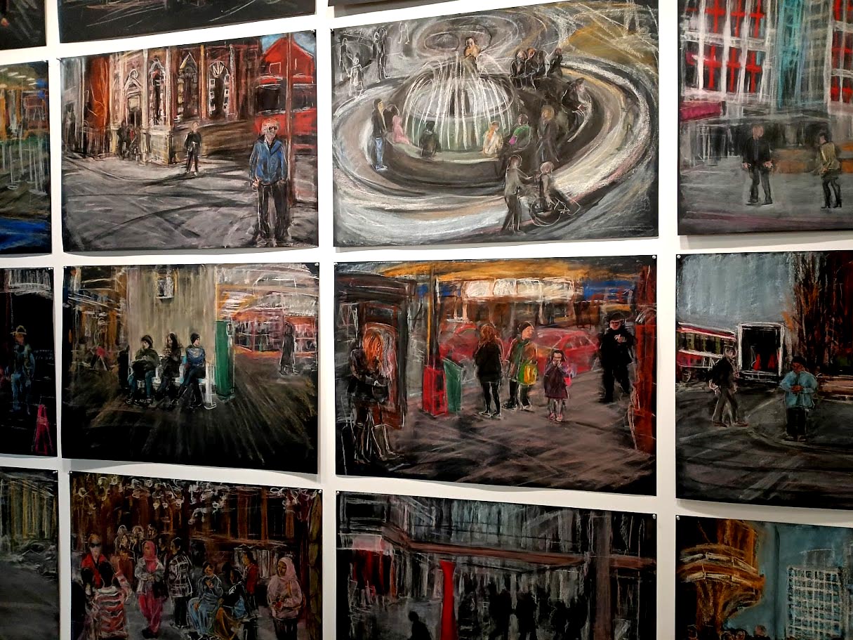 Particularly in her depictions of people, in urban settings, Sybil Goldstein offers compassion. Weary commuters rising on escalators or waiting patiently in line, shoppers at the Eaton Center and the Dufferin Mall, children playing in fountains, or the homeless, just trying to survive. Often there is an angel hovering nearby or a mysterious, dreamy glow so that all seem touched by something alien and graceful, something evoking the divine, something in all of us, even when we are hanging out in the PATH food court, wondering what to have for lunch.